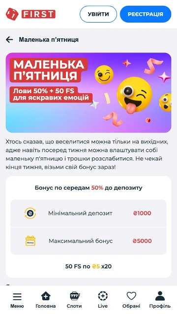 Кожної середи гравці Першого казино можуть отримати особливі бонуси на депозит. Він складає 50% +15 FS або 50% + 50 FS в залежності від суми внесеного депозиту.