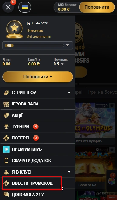 - Відкрийте сторінку активації промокоду. Вона може знаходитися у особистому профілі гравця, на сторінці бонусів, або ж у меню казино.